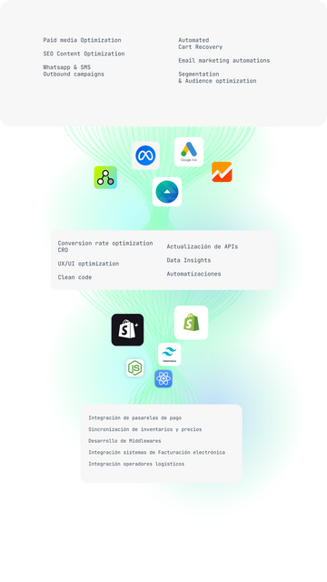 Nos especializamos en la gestión integral del e-commerce, abordando cada etapa del proceso para maximizar su rendimiento. Desde la generación de tráfico y la optimización del presupuesto de marketing digital, hasta la mejora del Storefront y la optimización de la tasa de conversión (CRO). Además, nos encargamos de la transaccionalidad, el desarrollo de integraciones y la automatización de flujos transaccionales, garantizando un crecimiento sostenible y escalable para tu negocio digital.