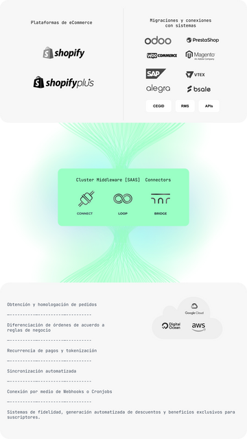 Nos encargamos de la integración de cualquier sistema con Shopify, garantizando crecimiento y escalabilidad a lo largo del tiempo. Permitimos que nuestros clientes se enfoquen en su negocio mientras, bajo el modelo de Software as a Service (SaaS), optimizamos costos al reducir significativamente la necesidad de desarrollar middlewares y conectores personalizados.